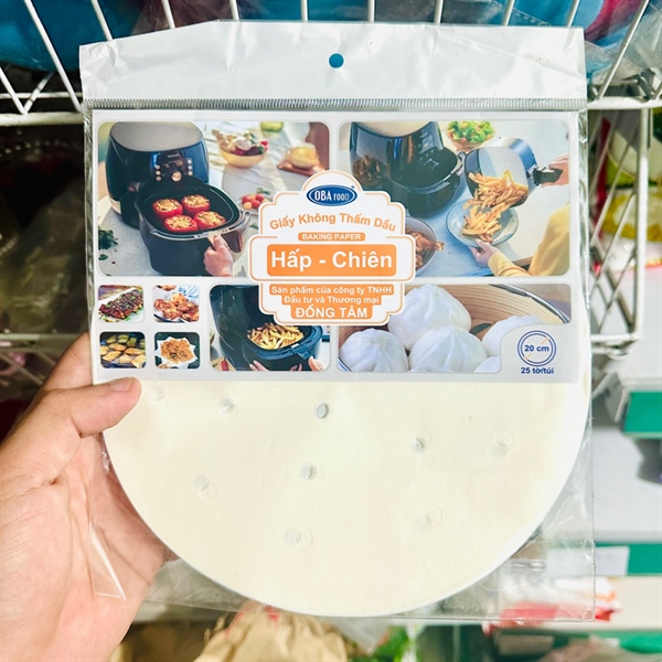- Công dụng: Giấy nến đục lỗ cho nồi chiên không dầu Oba Food 20cm giúp ngăn thực phẩm dính vào giỏ chiên, giúp việc vệ sinh nồi dễ dàng hơn, đồng thời giữ cho thực phẩm chín đều mà không bị thấm quá nhiều dầu mỡ. Sản phẩm phù hợp cho các món chiên, nướng trong nồi chiên không dầu.