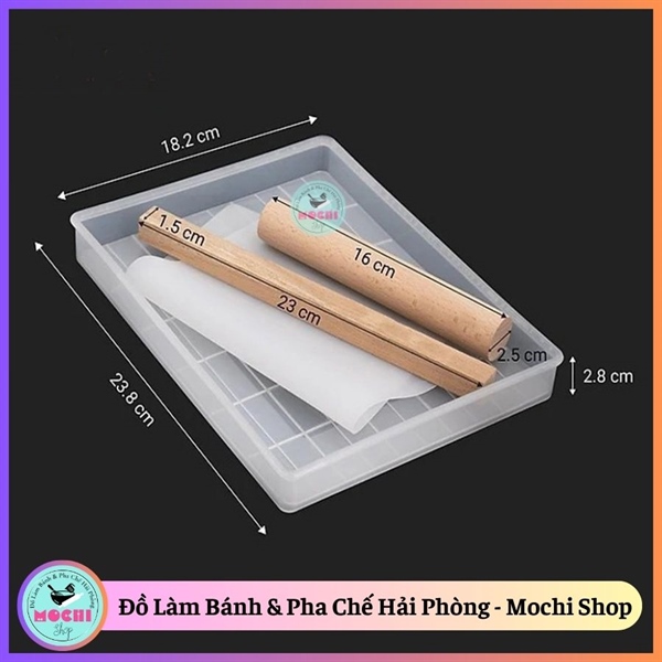 - Kích thước: 18.5x24x2.5cm. Một khuôn nhựa có chia vạch kích thước mỗi ô 3.8x1.6cm, chia thành 60 viên kẹo.